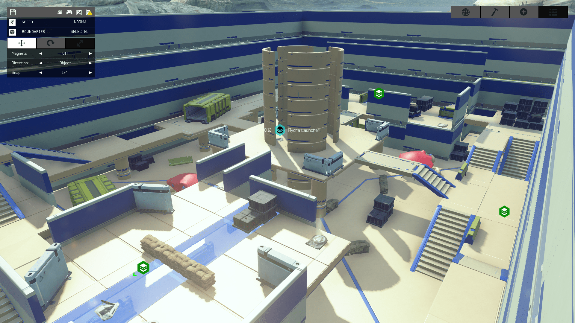 After creating the central spire, I created the rest of the smaller areas around the edges of the map one at a time, connecting the ones in the center of each side to the central spire. To prevent players from camping in one of the POEs, there are multiple routes to each of them, along with several jump pads placed around the map for fast traversal.